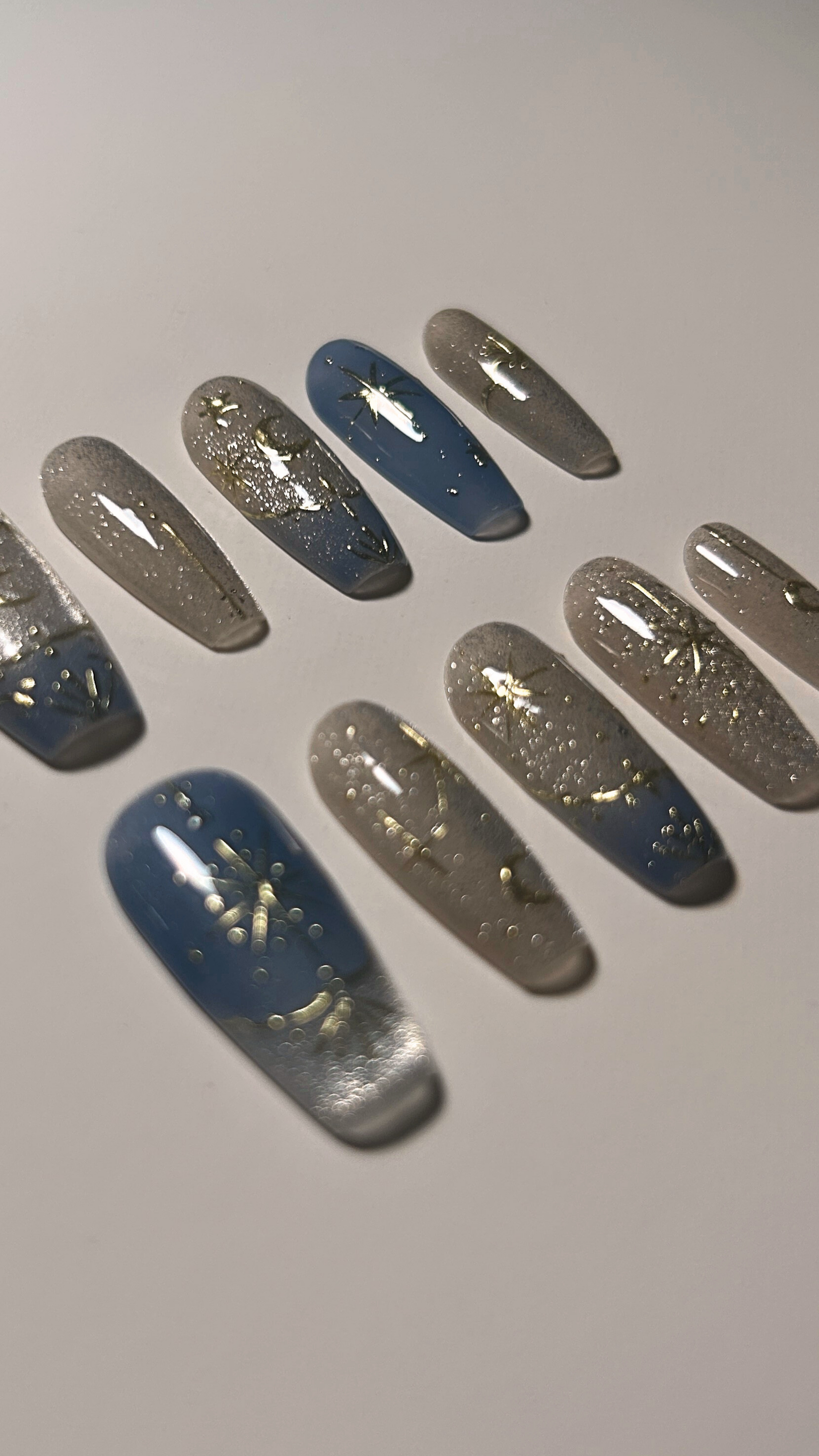 Celestial Dreams press-on nail set a€? a cosmic blend of shimmering silver and deep midnight blue, adorned with golden moons, stars, and constellations for an enchanting, starry-night look.
